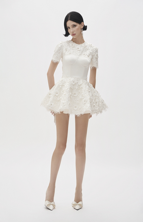 White mini dress layering with lace, 3D floral embroidery and crystal accents.