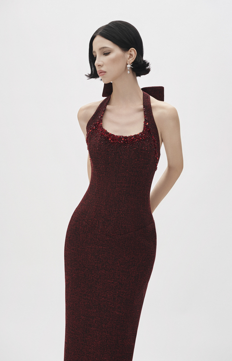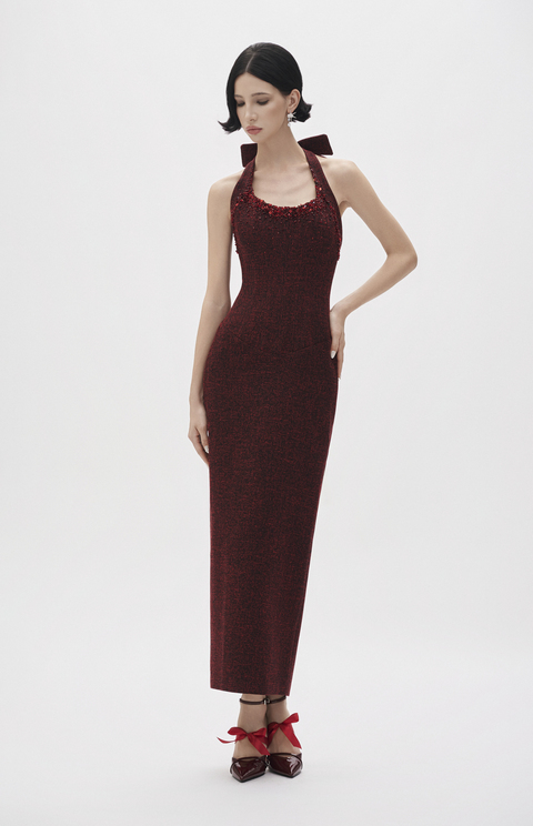 Sleeveless midi gown in melange tex canvas with crystals mix sequins shine and fluid back drape.