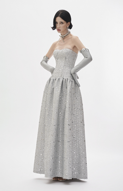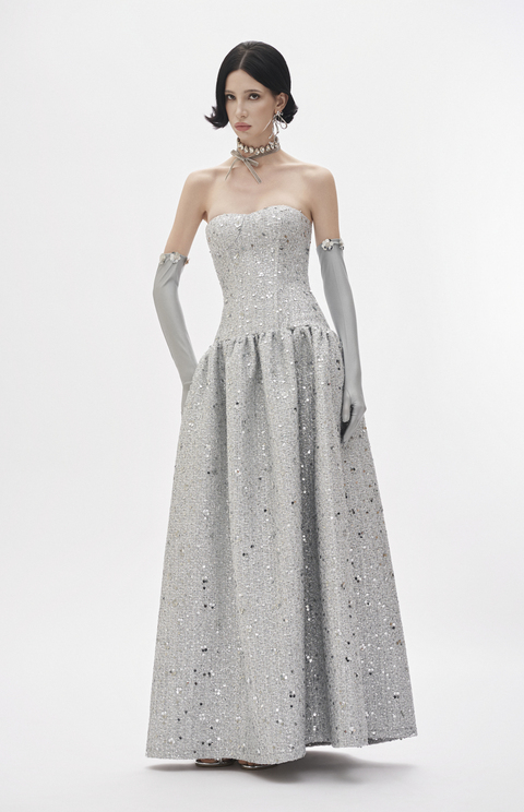 Silver intricate sequin tweed corset gown with taffeta lining and soft silk lower finish.