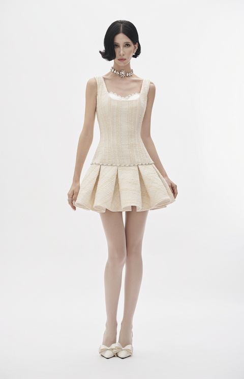 Cream tweed mini dress with pearl-crystal rope detailing and soft flared hem.