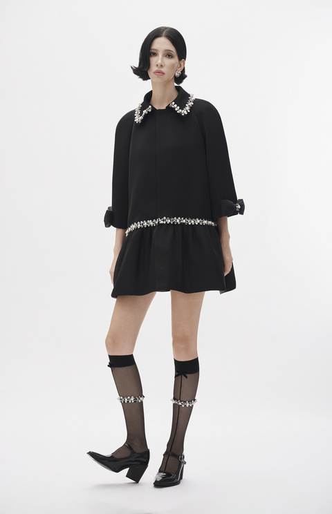 Black crepe-silk mini dress with “Mother of pearl” taffeta and organza detailing, crystal and pearl embellishment.