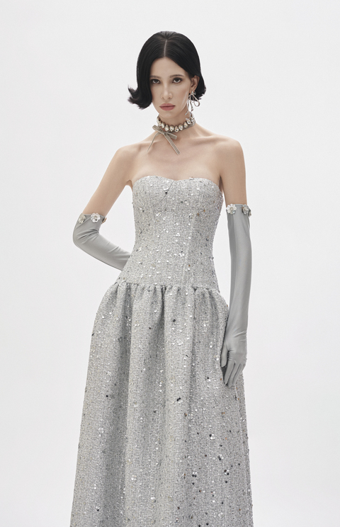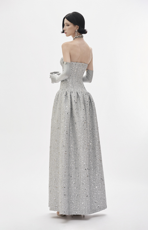 Silver intricate sequin tweed corset gown with taffeta lining and soft silk lower finish.