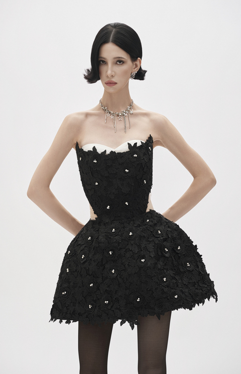 FALLEN STAR MINI DRESS Strapless mini dress adorned with 3D floral appliqués and pearl embellishments. Structured corset bodice with sculpted skirt silhouette that captures the balance between strength and delicacy.