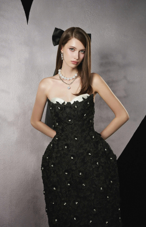 FALLEN STARLIGHT CORSET DRESS [LIMITED EDITION] Strapless column gown with 3D floral texture and pearl bead accents.
