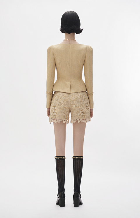 Beige tex canvas top with structured silhouette and sequin mix crystals finishing.