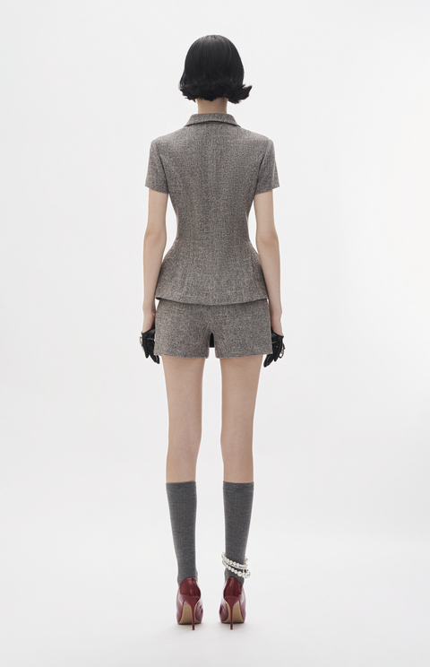 Grey tex canvas corset top with silk lining and tailored sculptural fit.