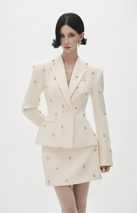 Cream tex canvas vest adorned with pearl and crystal embellishment.