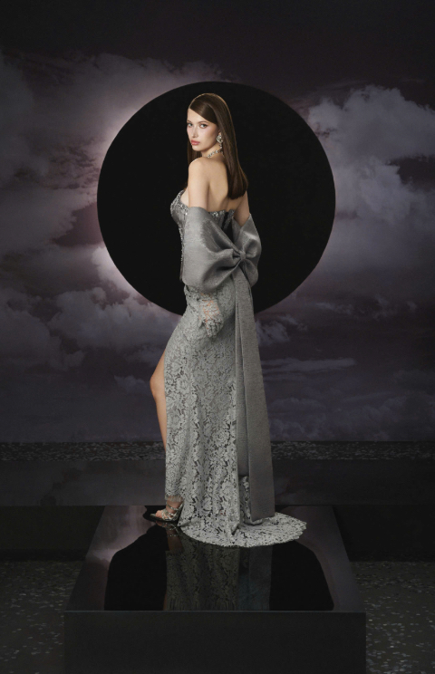 MOON DUST GOWN SET Strapless corset top with beaded embellishment with high-slit draped skirt.