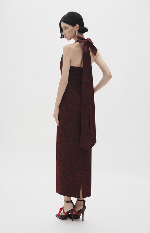 Sleeveless midi gown in melange tex canvas with crystals mix sequins shine and fluid back drape.