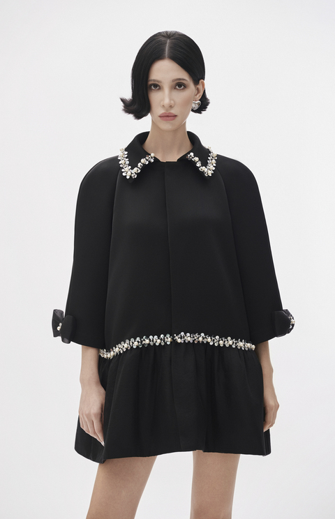 Black crepe-silk mini dress with “Mother of pearl” taffeta and organza detailing, crystal and pearl embellishment.